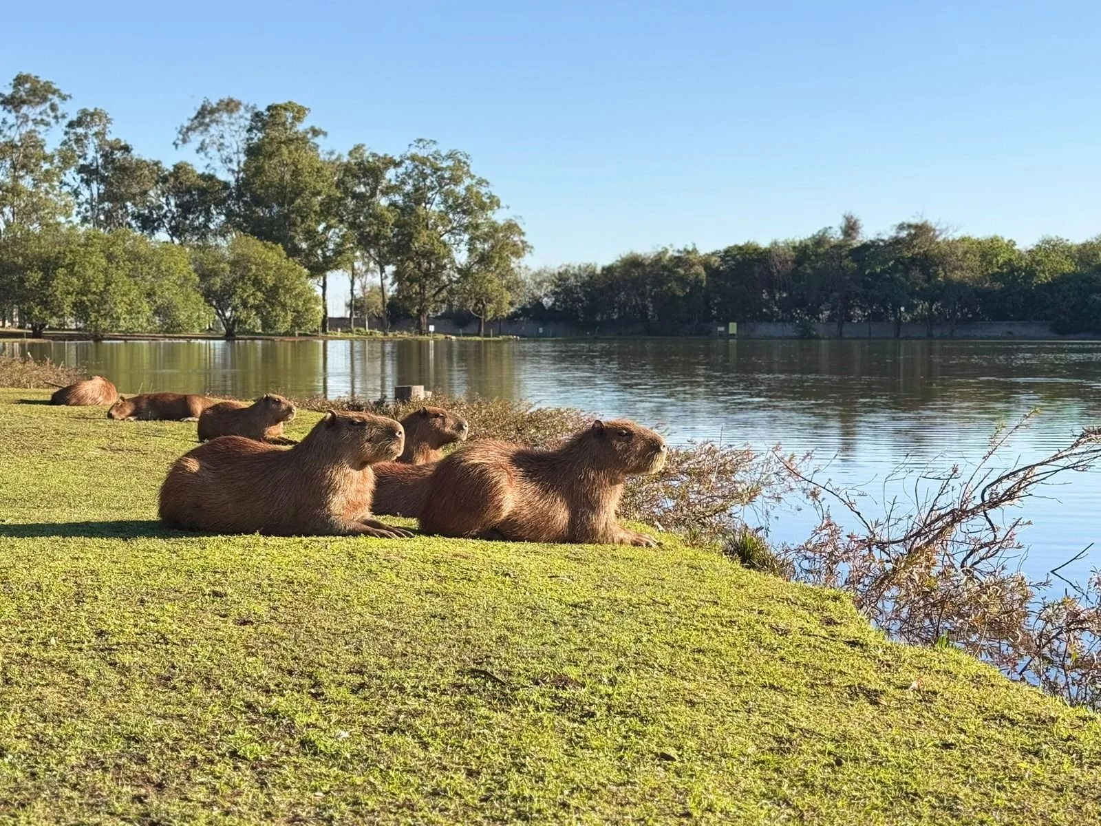 Capivaras no entorno do lago do Clube Indaiá: presença da fauna silvestre é acompanhada com monitoramento técnico e ações contínuas voltadas à segurança, saúde ambiental e convivência responsável. (Foto: Carol Oliveira)