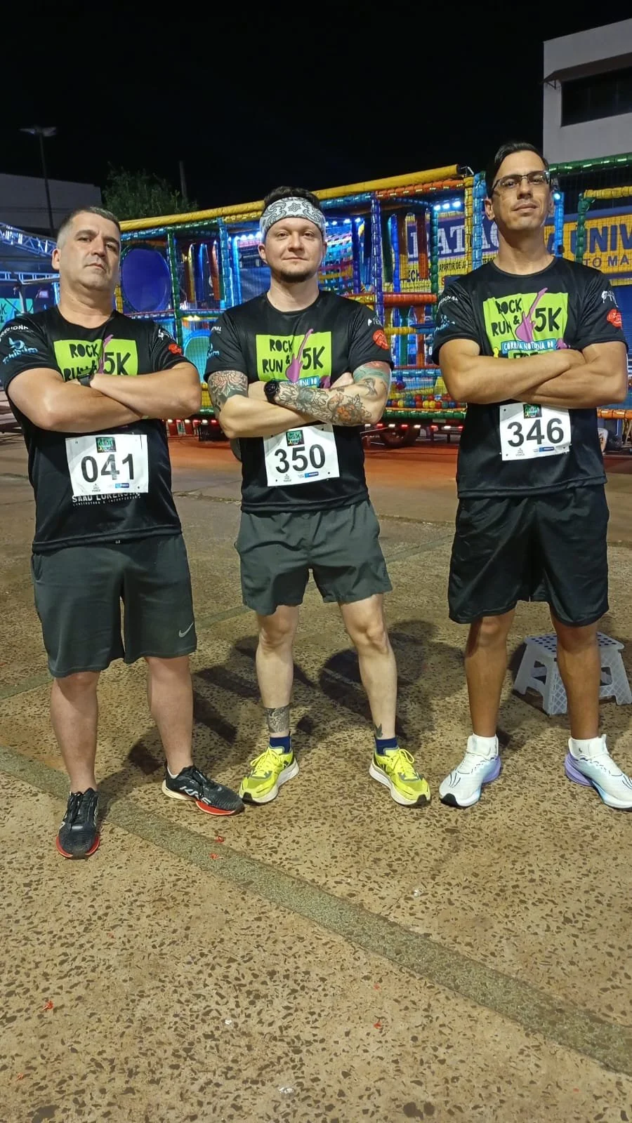 Os atletas Rodrigo, Ivan e Moacir que participaram da corrida Rock & Run 5K.